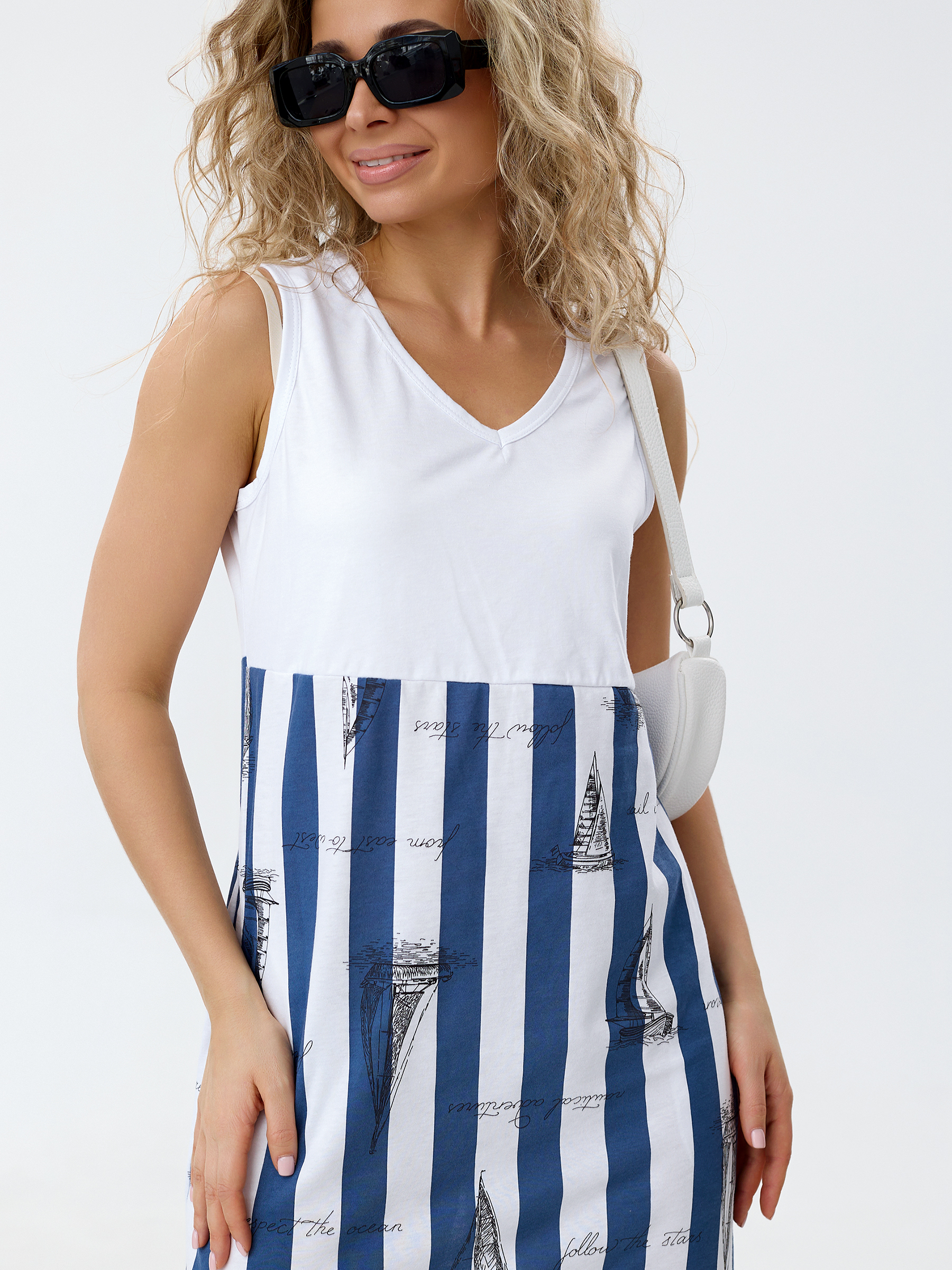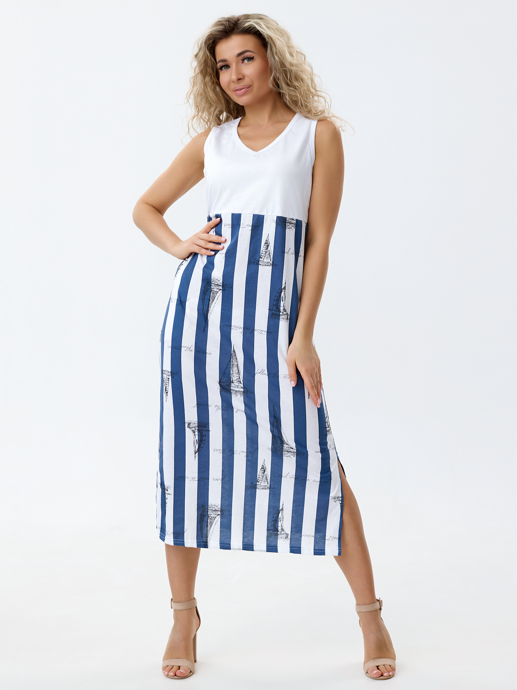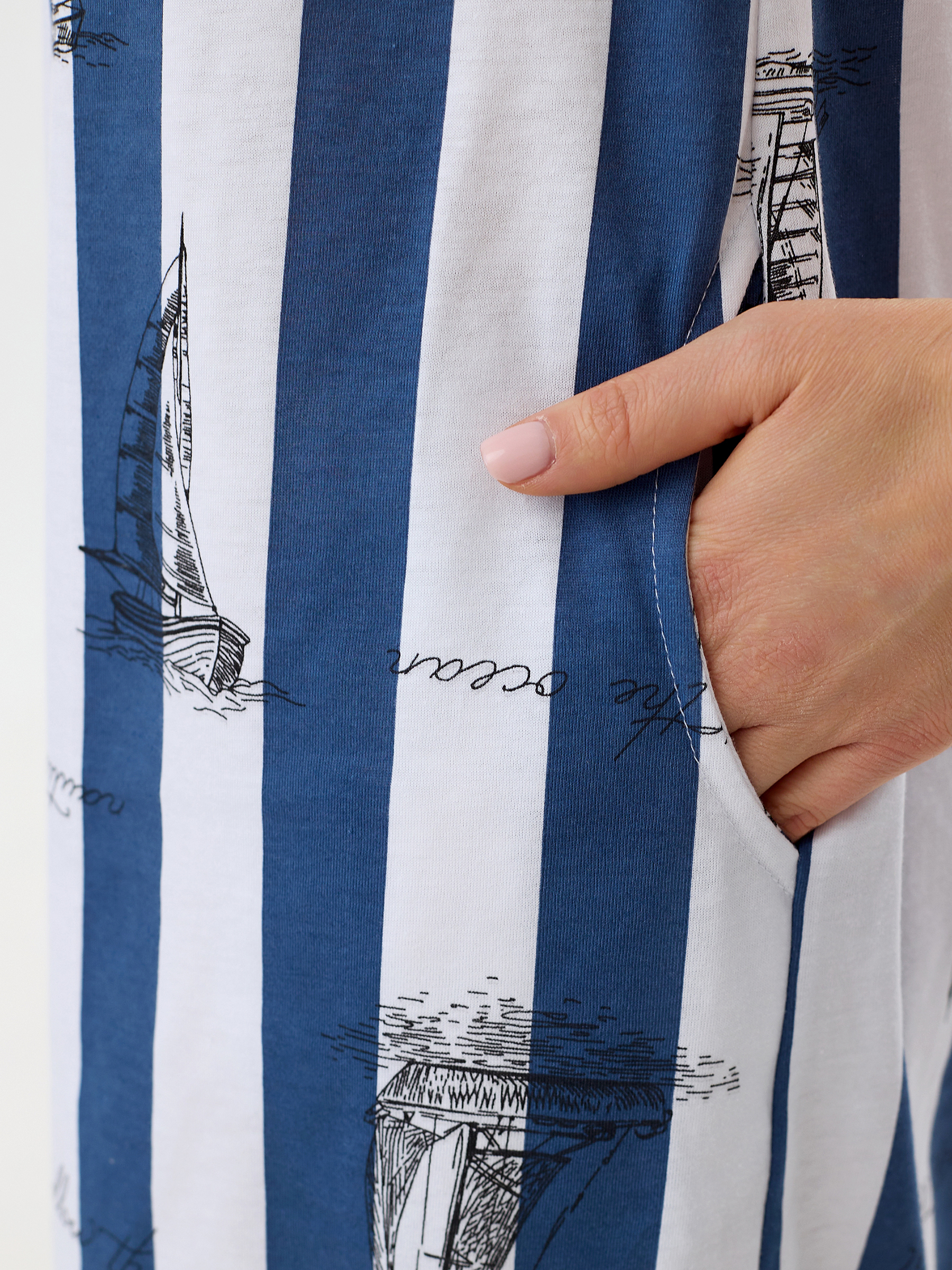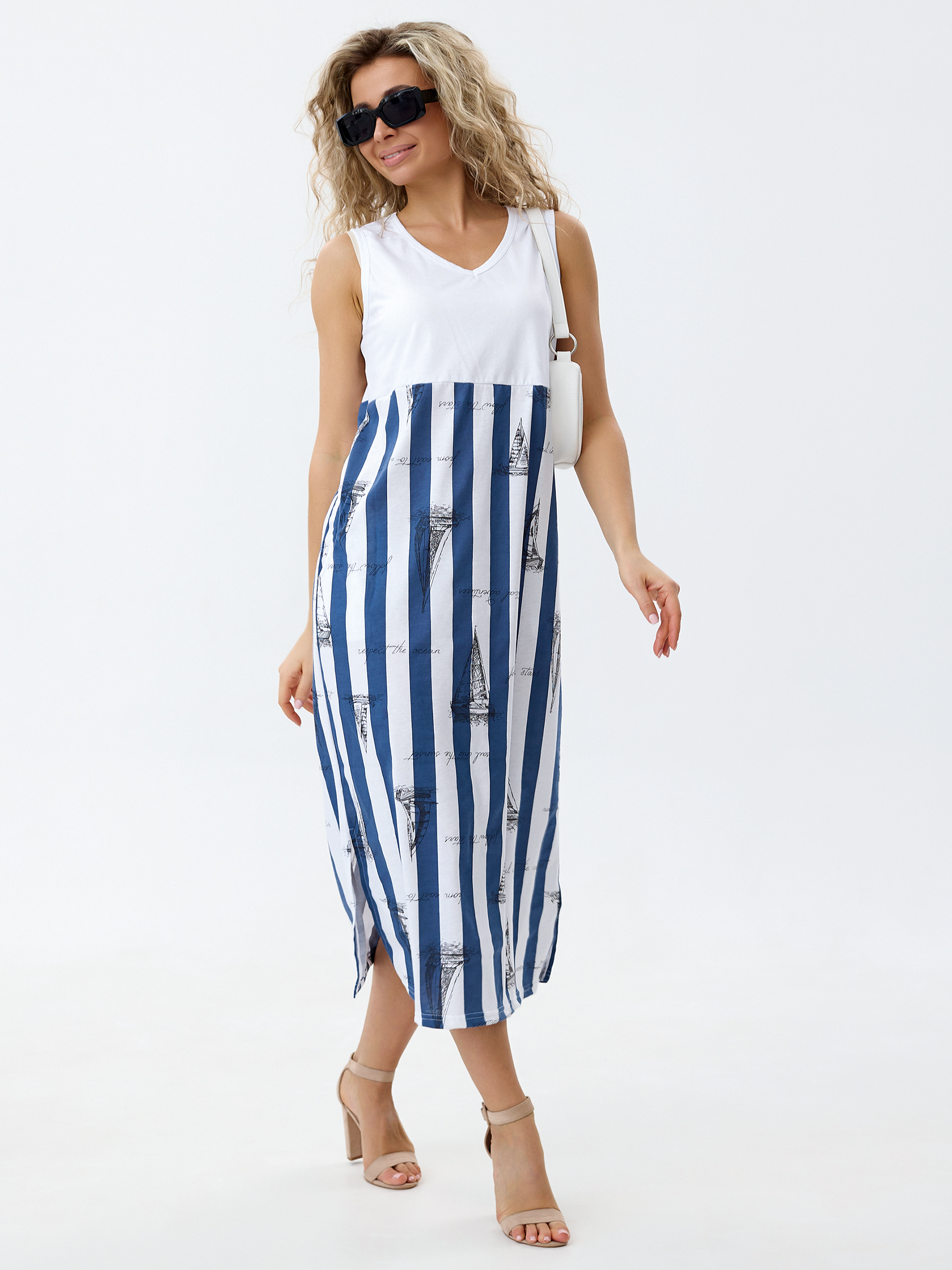 Сарафан домашний трикотажный в полоску с v- образным вырезом длина макси благодаря оригинальному принту, скрадывает все недостатки фигуры.